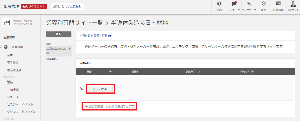 イプロス・ものづくり各出展管理画面にて、「業界別専門サイト」のメニューから各専門サイトへ情報を掲載することが可能です。